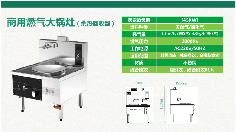 適用于企業(yè)、機(jī)關(guān)單位。灶具采用獨(dú)特的余熱回收技術(shù),滿足了廚房熱水不耗能的目的,同時大幅降低廚房煙灶溫度,減小了火災(zāi)風(fēng)險,為后廚工作人員創(chuàng)造了安全舒適的環(huán)境,解決了企業(yè)單位運(yùn)營過程中的環(huán)保節(jié)能問題,提高了生產(chǎn)效率。