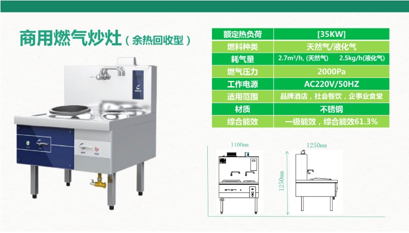 簡介—— 適用于企業、機關單位。灶具采用獨特的余熱回收技術,滿足了廚房熱水不耗能的目的,同時大幅降低廚房煙灶溫度,減小了火災風險,